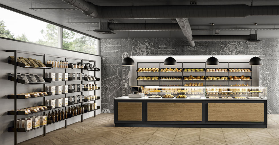 Banchi, retrobanchi, scaffalature: un intero sistema d’arredamento per panetterie. Il sistema si appoggia su due diversi tipi di banchi: Vetrine Large e Vetrine Midi.